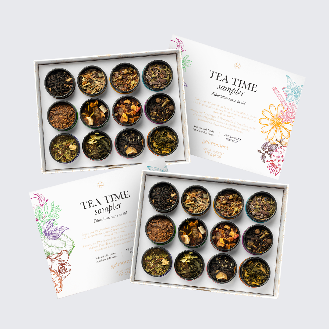 Discover your favourite of our 12 premium loose-leaf tea blends with gelmoment's NEW tea time sampler box. Our teas are all made from ingredients that we proudly source from women-owned farms around the world. Plus, our delicious blends are free of GMOs and infused with biotin, making them an eco-friendly beverage that also helps nourish your skin, nails, and hair.